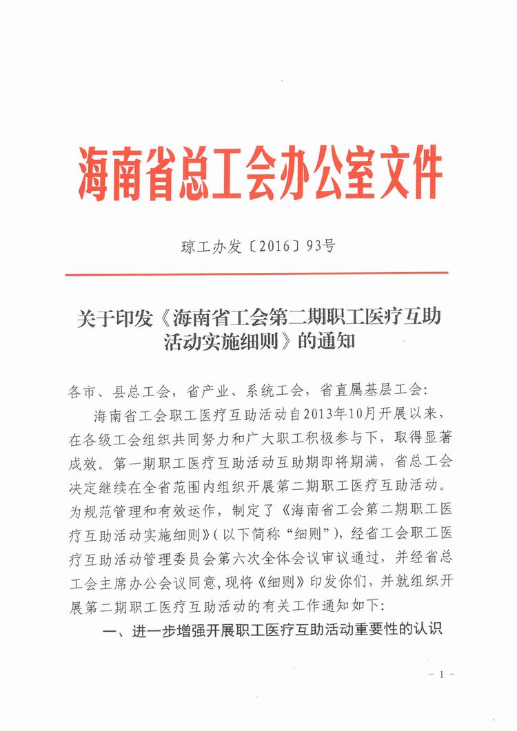 关于印发《海南省工会第二期职工医疗互助活动实施细则》的通知,琼工办发[2016]93号