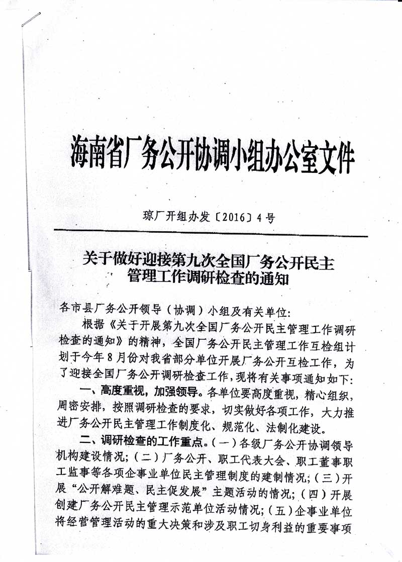 琼厂开组办发[2016]4号关于做好迎接第九次全国厂务公开民主管理工作调研检查的通知