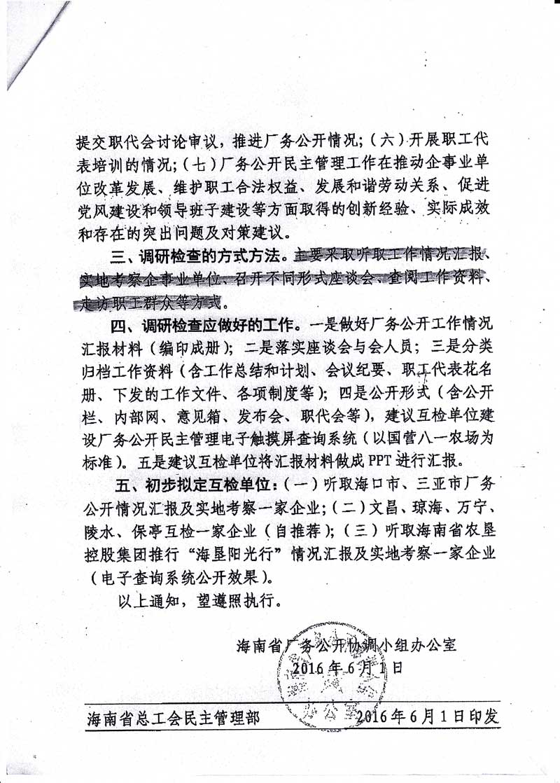 关于开展全省厂务公开民主管理示范单位考评的通知,琼厂开组办发[2016]5号