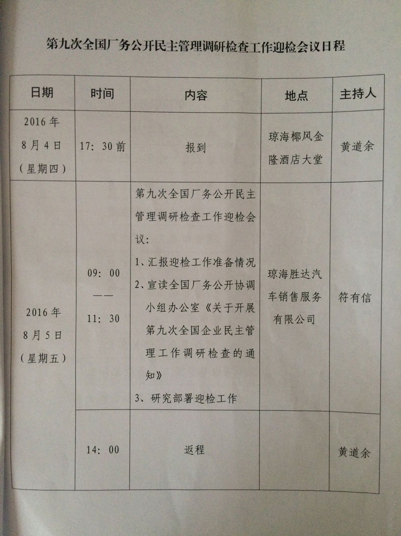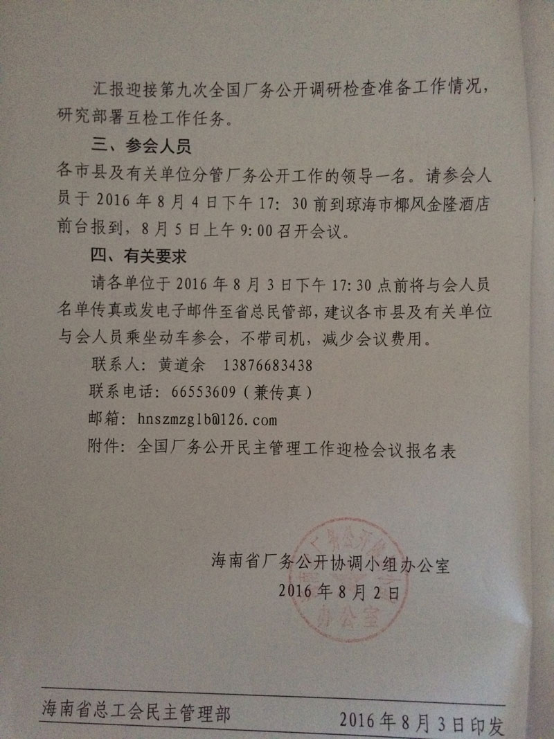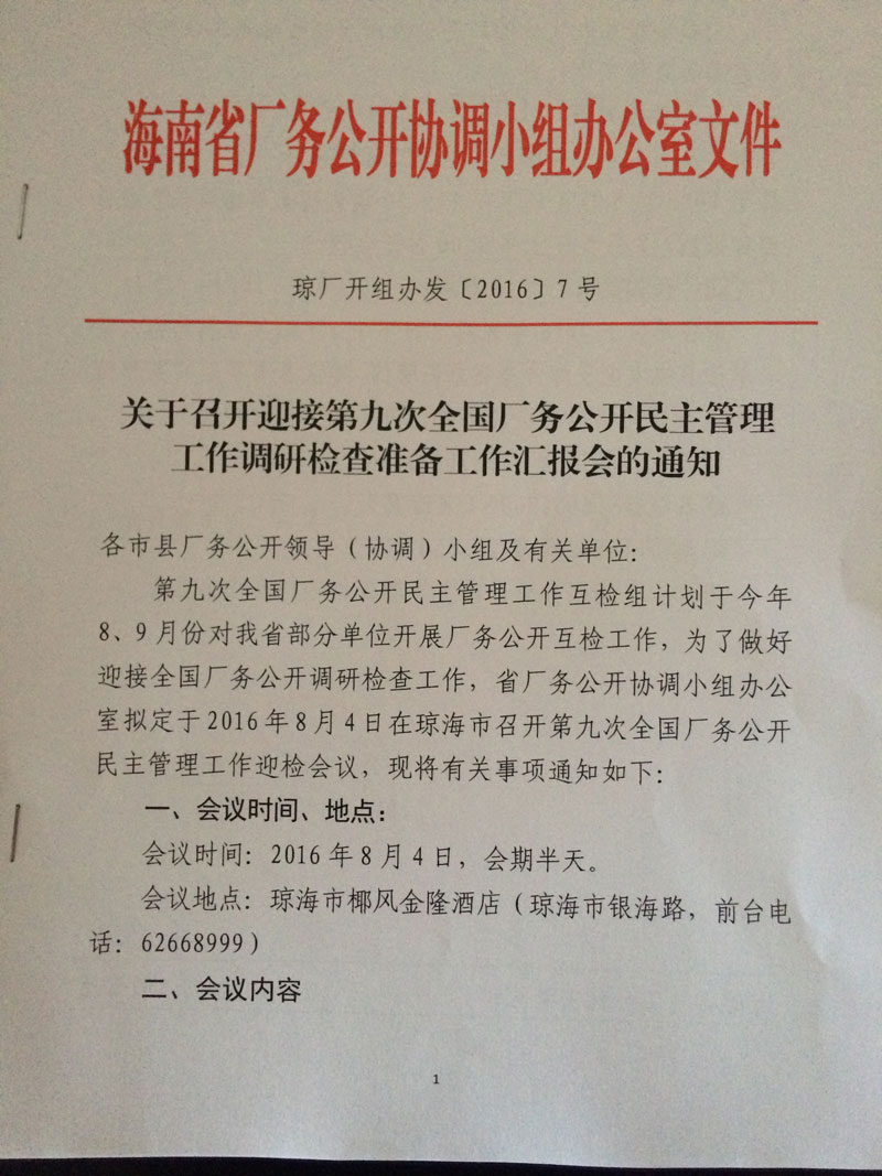 关于召开迎接第九次全国厂务公开民主管理工作调研检查准备工作汇报会的通知(琼厂开组办发[2016]7号)
