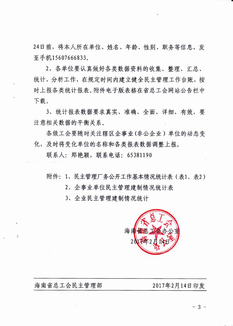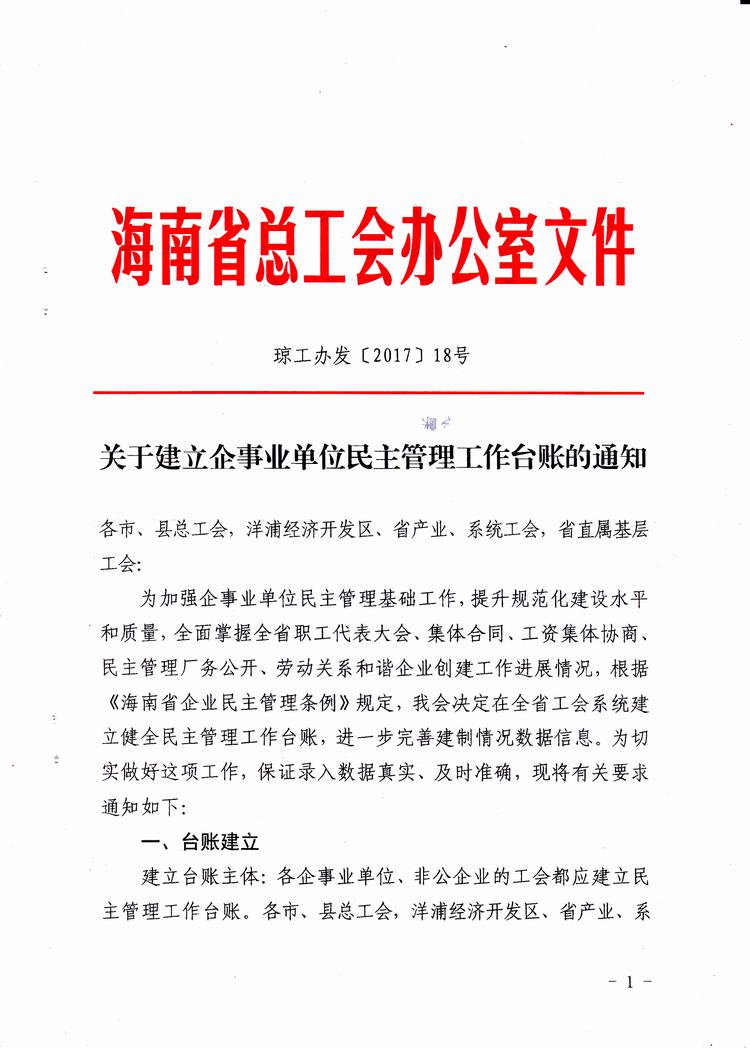 关于建立企事业单位民主管理工作台账的通知(琼工办发[2017]18号)